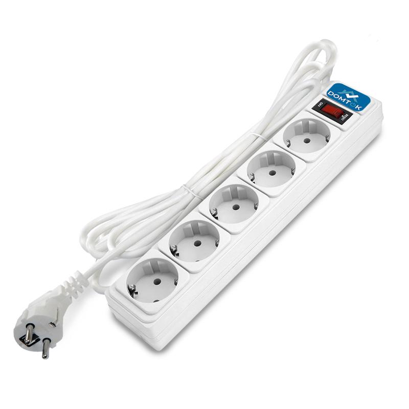 Удлинитель с сетевым фильтром 5х5м с заземл 10А IP20 2.2кВт ПВС 3х1 с выкл. бел. DOMTOK 2529