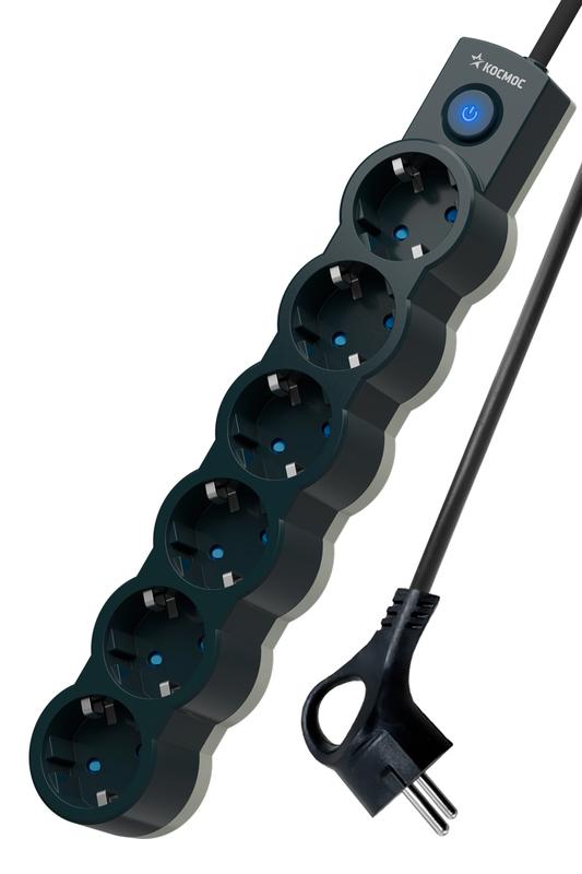 Удлинитель 6х3м с заземл. 10А IP20 2200Вт 220В защ. шторки ПВС 3х1 с выкл. черн. КОСМОС YKsm3m-6g-Z-V10A-B