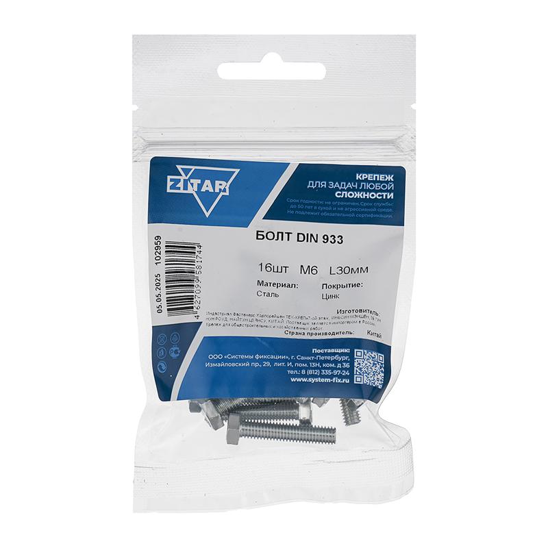 Болт с шестигранной головкой М6х30 DIN 933 класс прочн. 8.8 оцинк. (пакет) (уп.16шт) Tech-Krep/Zitar 102959