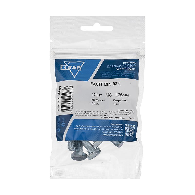 Болт с шестигранной головкой М8х25 DIN 933 класс прочн. 8.8 оцинк. (пакет) (уп.12шт) Tech-Krep/Zitar 102968