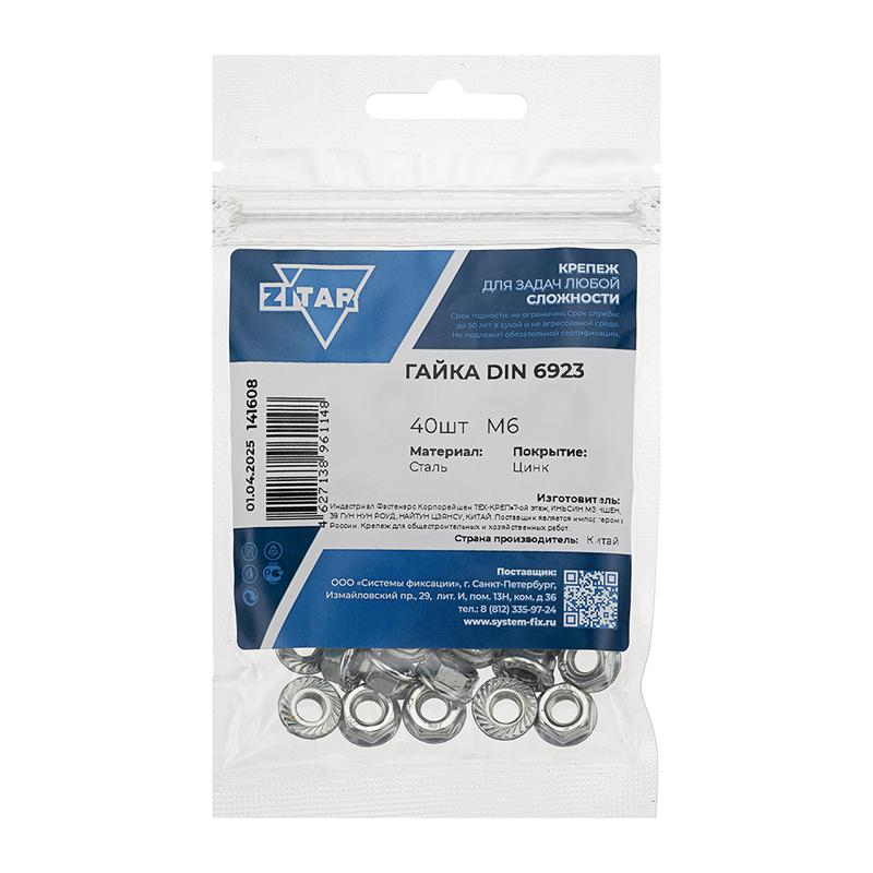 Гайка шестигранная с фланцем М6 DIN 6923 цинк. (пакет) (уп.40шт) Tech-Krep/Zitar 141608
