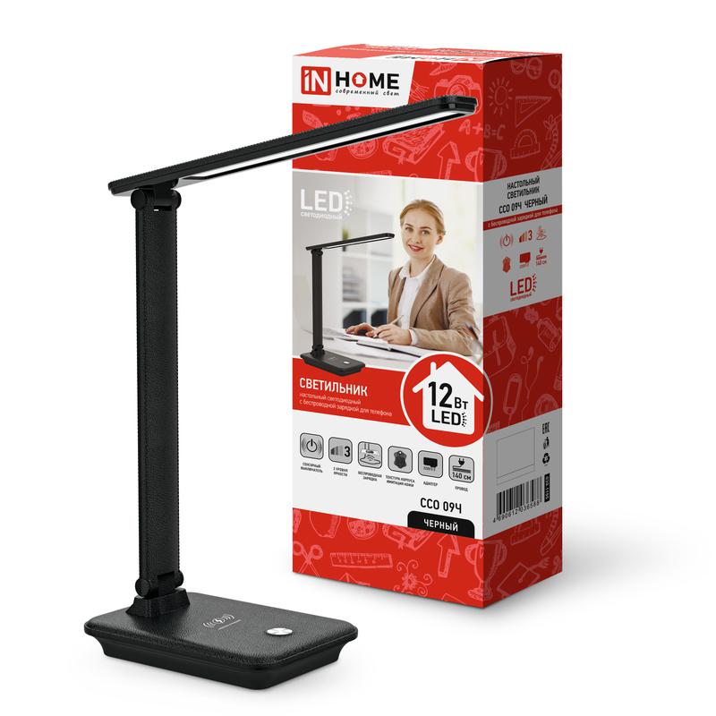 Светильник светодиодный настольный ССО 09Ч 12Вт 3000-6500К 600лм сенсор-диммер с беспров. зарядкой для телефона с адаптером черн. IN HOME 4690612036588