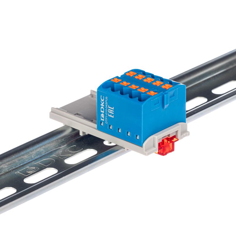 Блок распределительный с вертикал. адаптером на рейки шир. 15/35мм зажим push-in 10 точек подключения 2.5кв.мм син. DKC DTP1-010-04SPUB-V