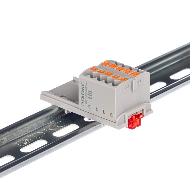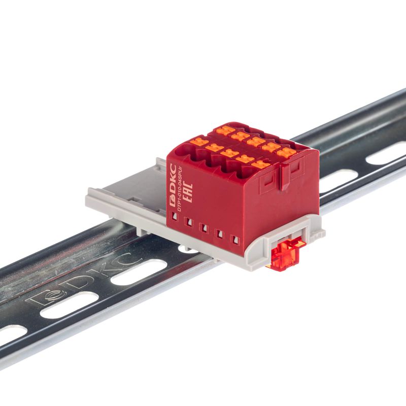 Блок распределительный с вертикал. адаптером на рейки шир. 15/35мм зажим push-in 10 точек подключения 2.5кв.мм красн. DKC DTP1-010-04SPUR-V