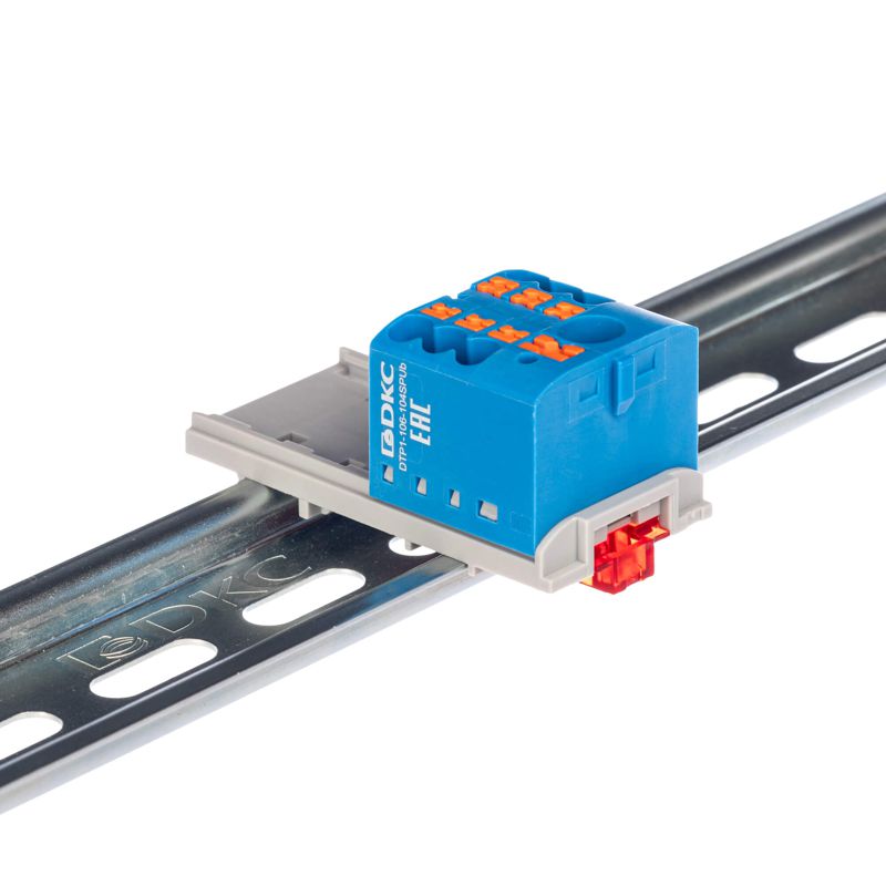 Блок распределительный с вертикал. адаптером на рейки шир. 15/35мм зажим push-in 1 ввод 6кв.мм 6 точек подключения 2.5кв.мм син. DKC DTP1-106-104SPUB-V