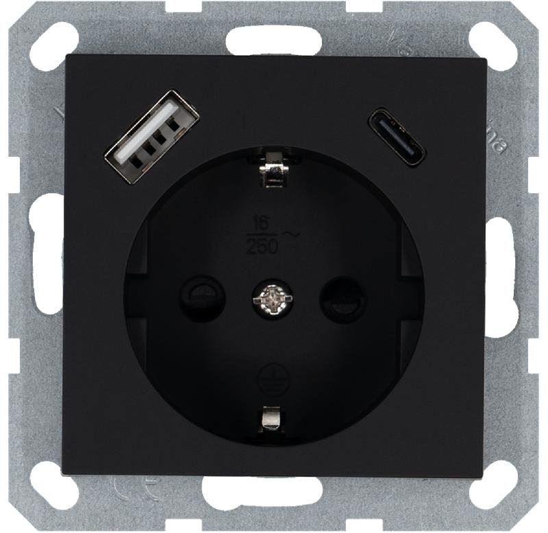 Розетка Shuko 16А с заземл. защ. шторки с 2-мя заряд. устройствами USB тип A+C 25Вт механизм черн. матов. soft touch Jasmart G5501USB-25PB
