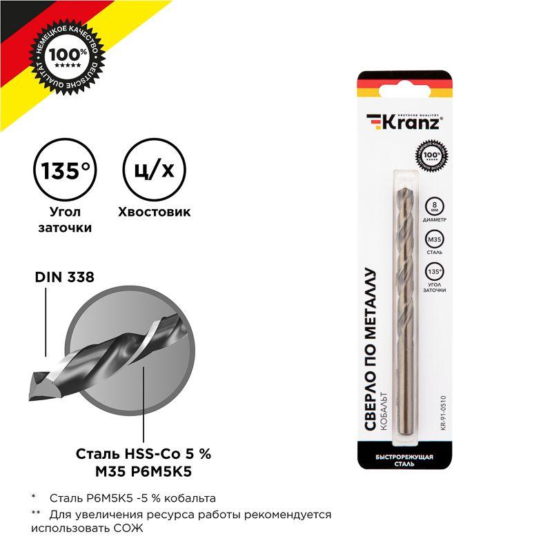 Сверло по металлу 8мм "Кобальт" (сталь HSS-Co 5% M35 P6M5K5) DIN 338 (блист.1шт) Kranz KR-91-0510