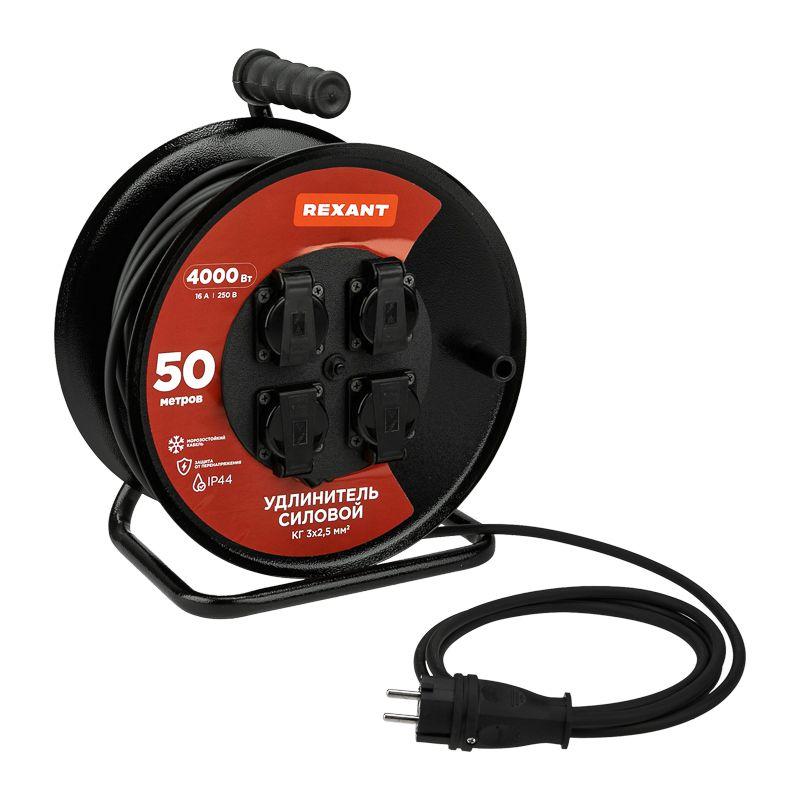 Удлинитель на метал. катушке 4х50м с заземл. IP44 КГ 3х2.5кв.мм с выключателем с защ. крышками Rexant 13-5016