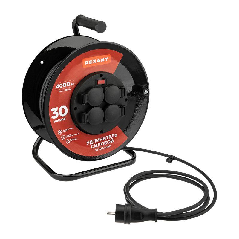 Удлинитель на метал. катушке 4х30м с заземл. IP44 КГ 3х2.5кв.мм с выключателем с защ. крышками Rexant 13-5014