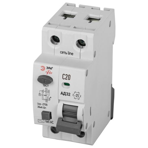 Выключатель автоматический дифференциального тока 2п (1P+N) C 20А 30мА тип AC 6кА АД-32 электрон. защита 230В PRO D326E2C20AC30P Эра Б0059112