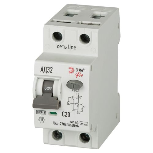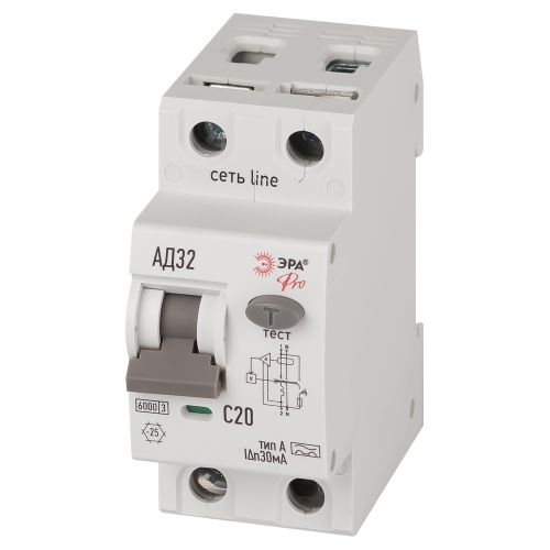 Выключатель автоматический дифференциального тока 2п (1P+N) C 20А 30мА тип A 6кА АД-32 электрон. PRO D326E2C20A30 Эра Б0059196
