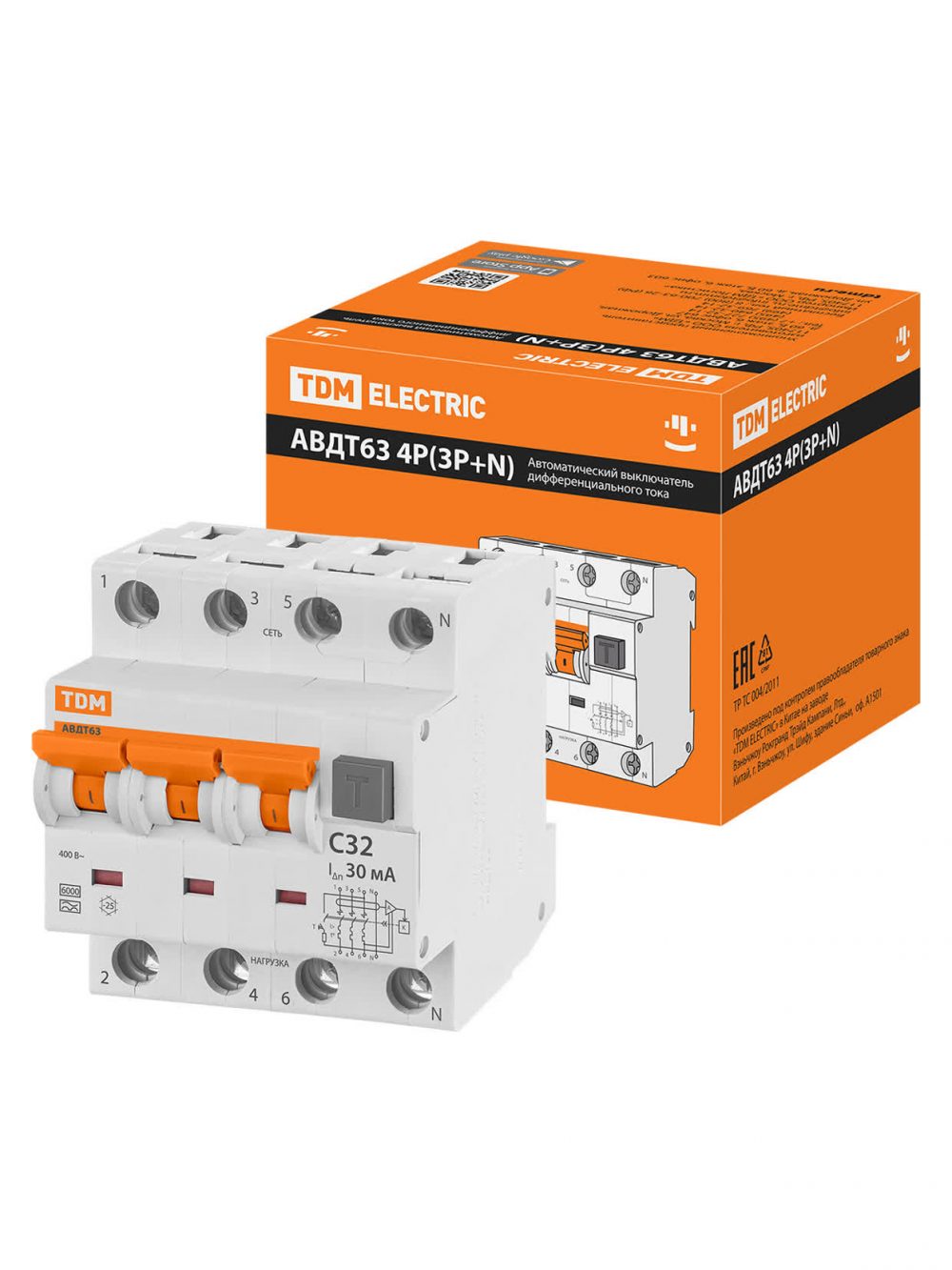 АВДТ 63 4P(3Р+N) C32 30мА 6кА тип А - Автоматический Выключатель Дифференциального тока TDM