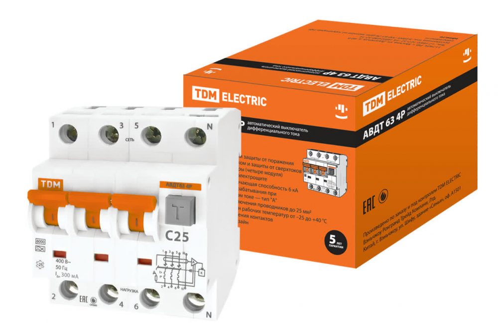 АВДТ 63 4P(3Р+N C25 30мА 6кА тип А - Автоматический Выключатель Дифференциального тока TDM