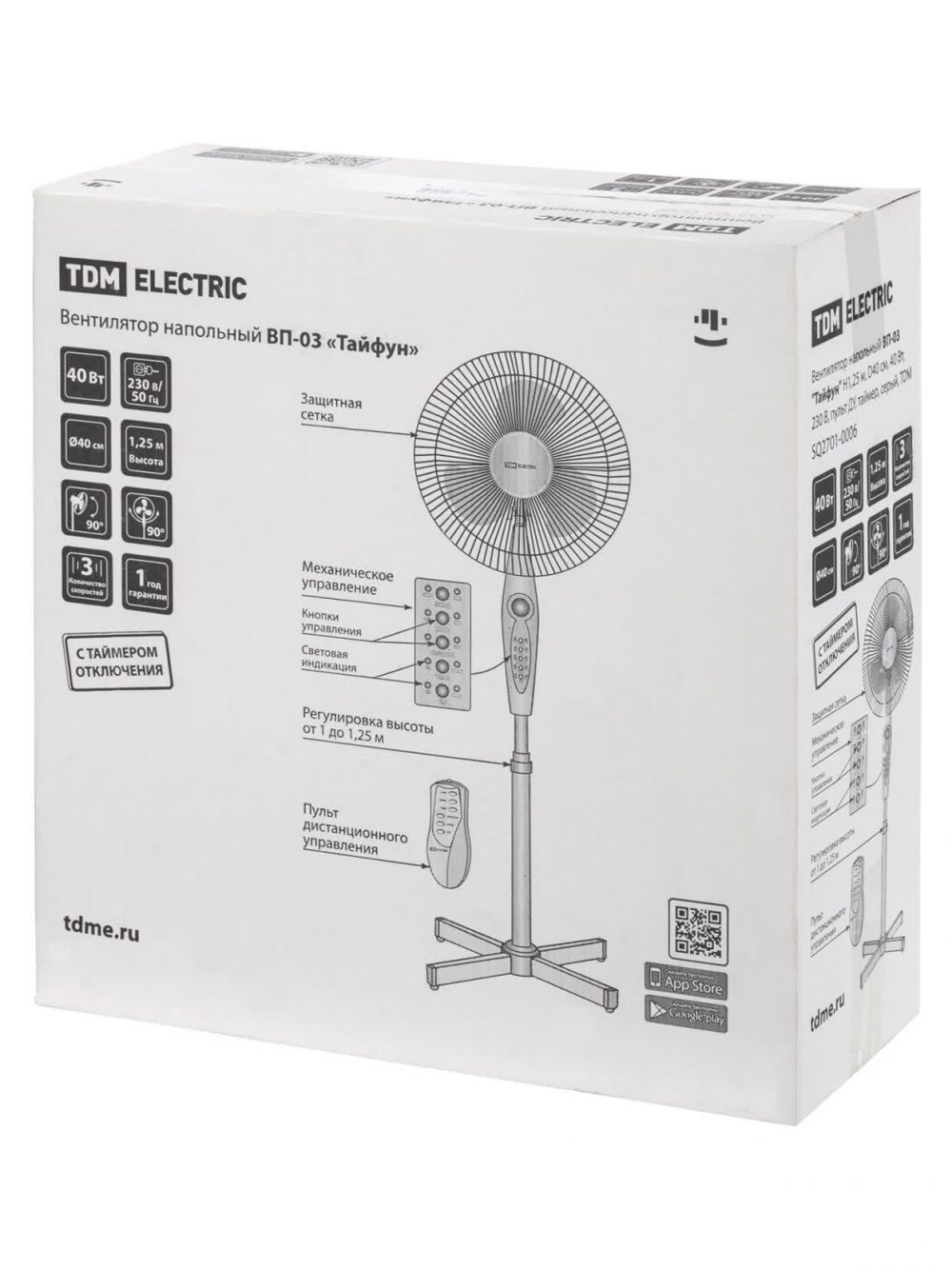 Вентилятор напольный ВП-03 "Тайфун" H1,25 м, D40 см, 40 Вт, 230 В, пульт ДУ, таймер, серый, TDM