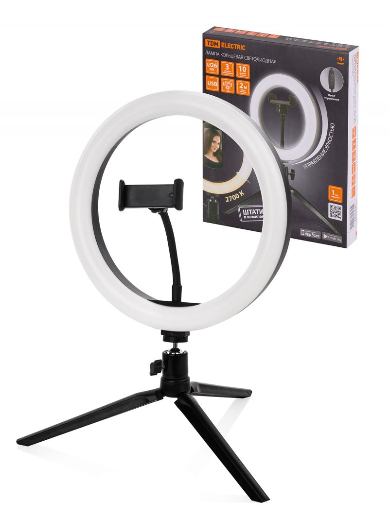 Лампа кольцевая светодиодная 26 см, 12 Вт, 2700-6400 К, штатив наст., диммер, USB, TDM