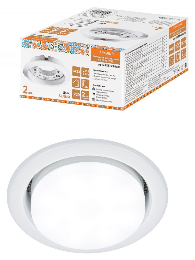 Светильник встраиваемый СВ 01-08 GX53 220 В 50 Гц, белый, 2 шт/уп, Народный