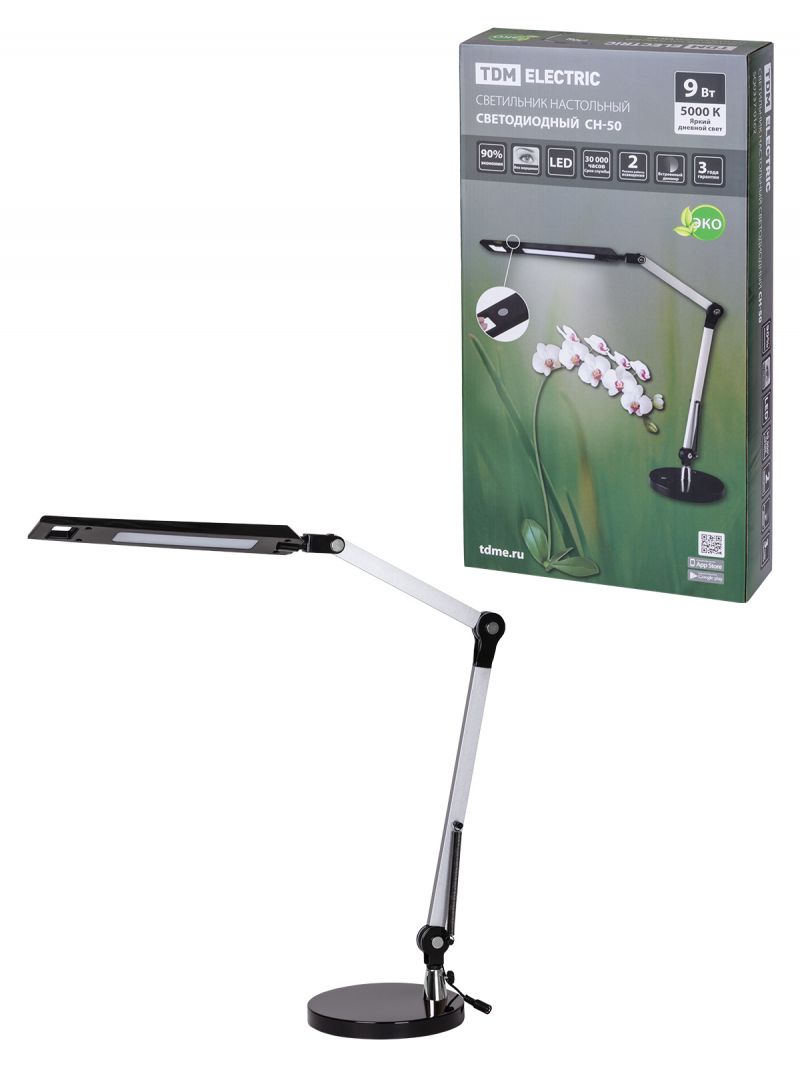 Светильник светодиодный настольный СН-50, 2 колена, диммер, 220 В, 9 Вт, 5000 К, сереб-черн, TDM