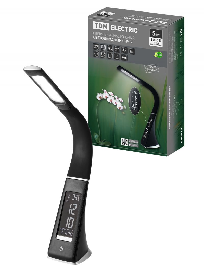 Светильник светодиодный-часы СНЧ-2, 5 Вт, календ., терм-р, 5000 К, сенсор-диммер, USB, черный, TDM