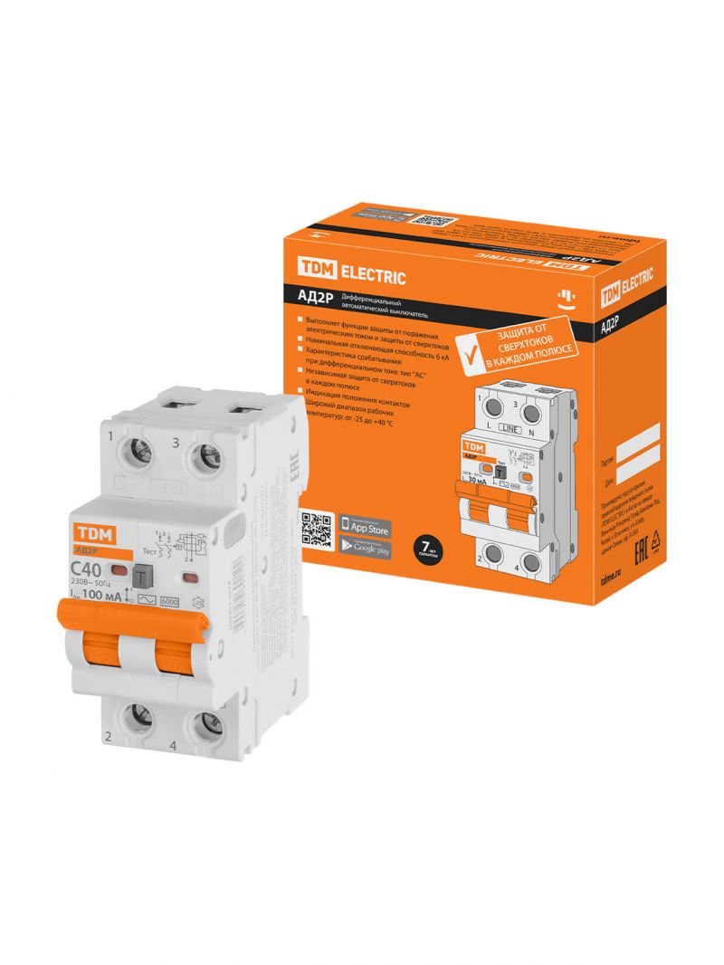 Дифференциальный автоматический выключатель АД2P 2Р С40 100мА 6кА тип АС TDM