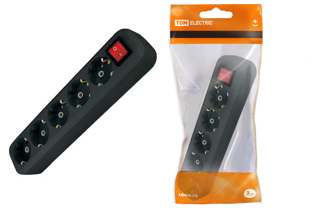 Колодка розеточная 5 гнезд 2П+3 с выключателем16А 250В черная TDM