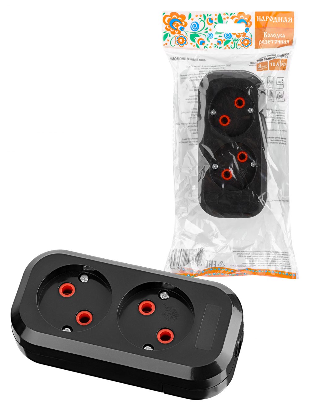 Колодка розеточная 2 гнезда 2П б/з 10А 250В черная серии "Народная"