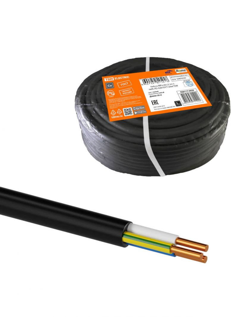 Кабель ВВГнг(А)-LS 3х1,5 ок(N, PE)-0,66 ГОСТ (20м) TDM