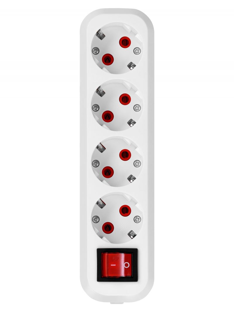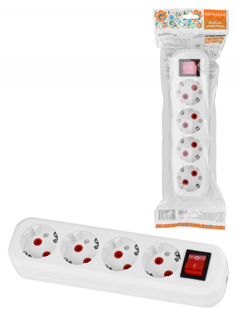 Колодка розеточная 4 гнезда 2П+3 c выключателем 16А 250В белая серии "Народная"