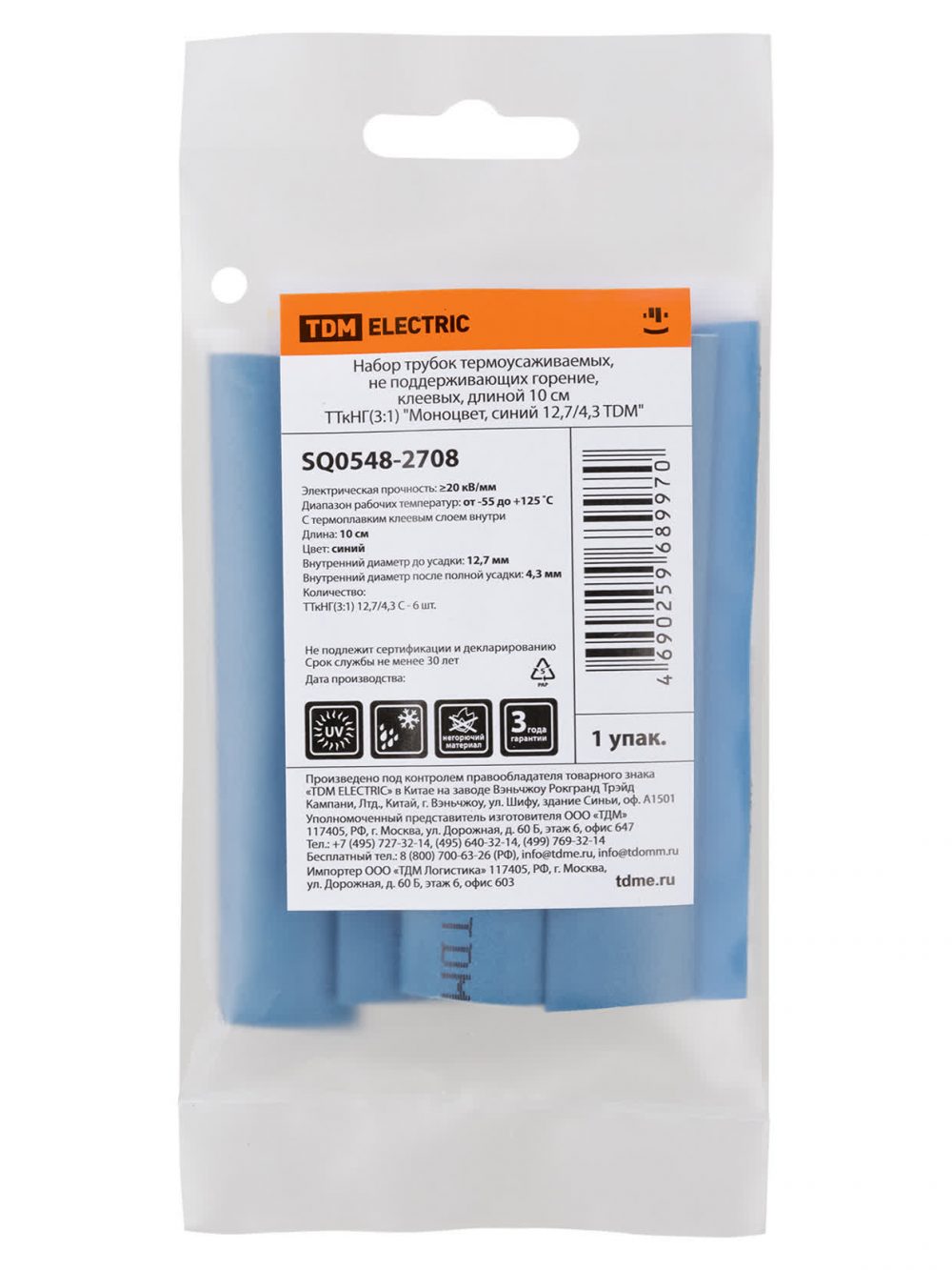 Набор трубок термоусаживаемых, не поддерживающих горение, клеевых, длиной 10 см ТТкНГ(3:1) "Моноцвет, синий 12,7/4,3 TDM"
