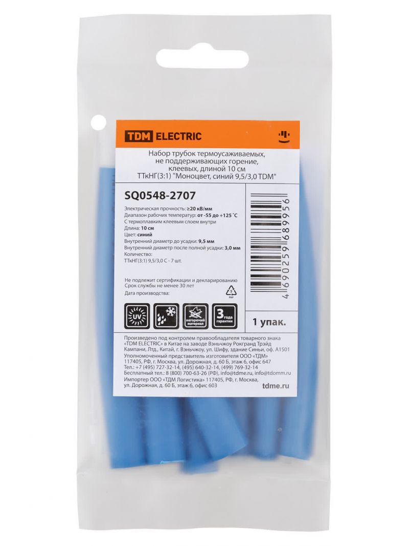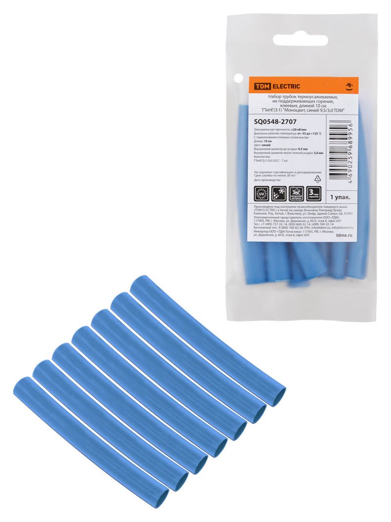 Набор трубок термоусаживаемых, не поддерживающих горение, клеевых, длиной 10 см ТТкНГ(3:1) "Моноцвет, синий 9,5/3,0 TDM"
