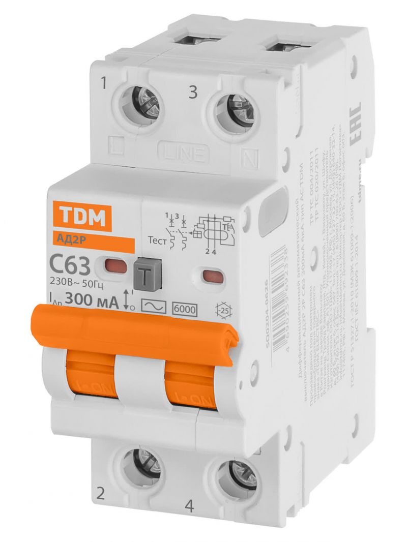 Дифференциальный автоматический выключатель АД2P 2Р С63 300мА 6кА тип АС TDM