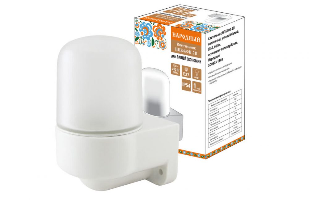 Светильник НПБ400-2П настенный, угловой белый, IP54, 60 Вт, основание-поликарбонат, Народный