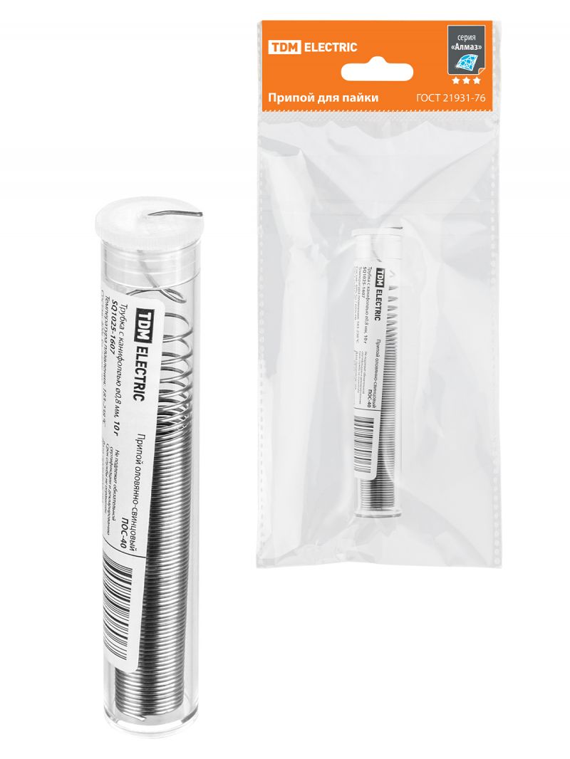 Припой ПОС 40, трубка с канифолью, ГОСТ 21931-76, Ø1 мм, 200 г, катушка, инд. упак., "Алмаз" TDM
