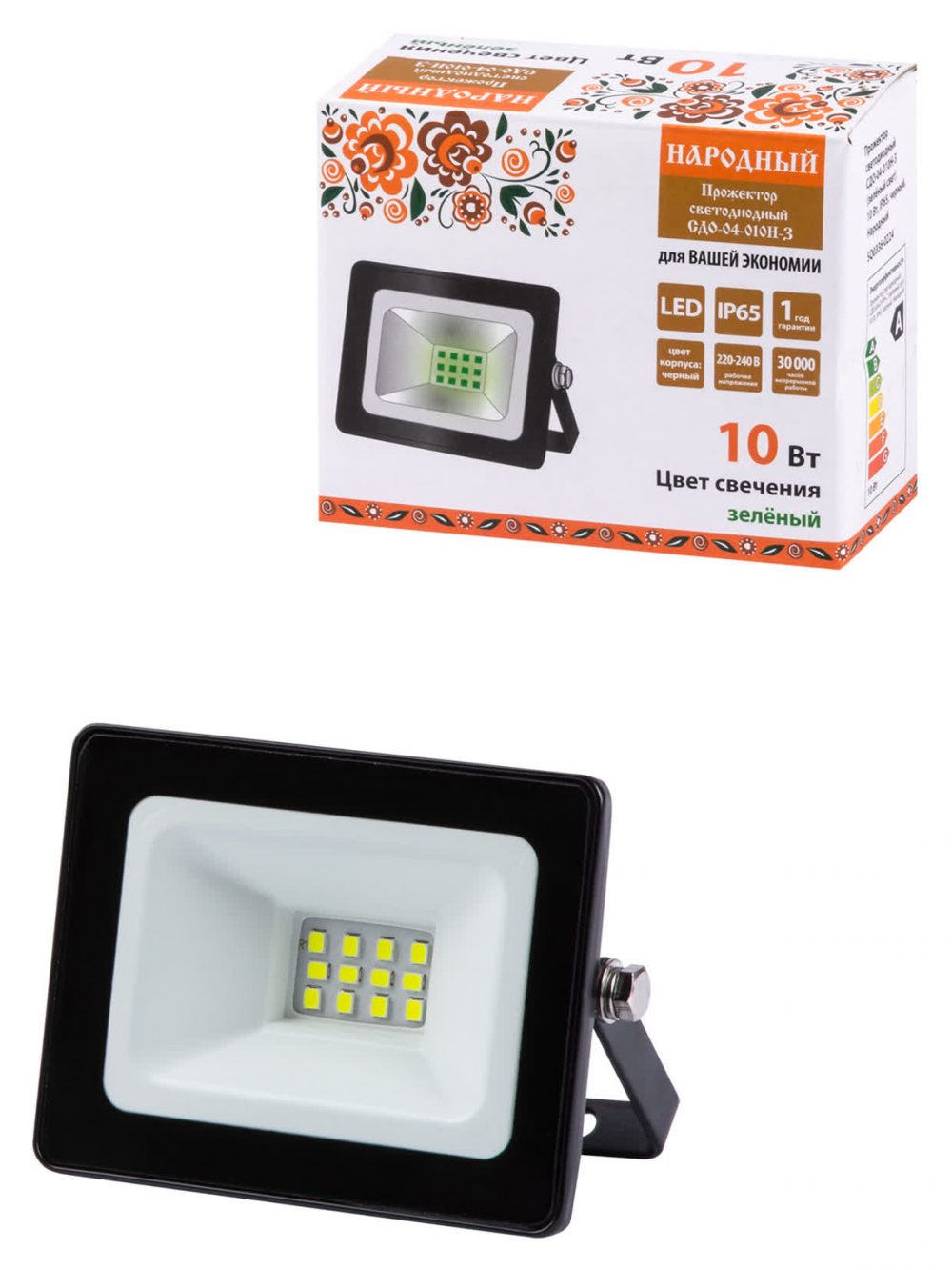 Прожектор светодиодный СДО-04-010Н-З (зелёный свет) 10 Вт, IP65, черный, Народный
