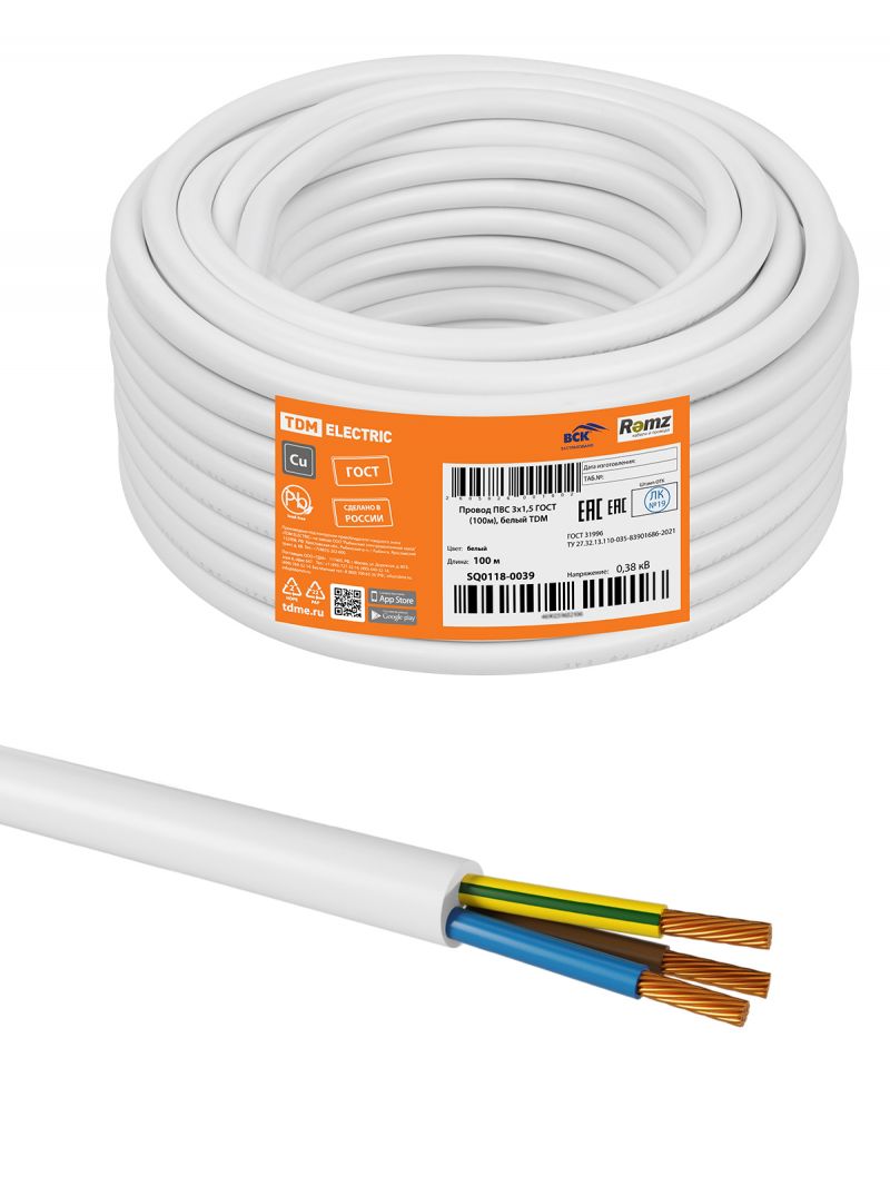 Провод ПВС 3х1,5 ГОСТ (100м), белый TDM