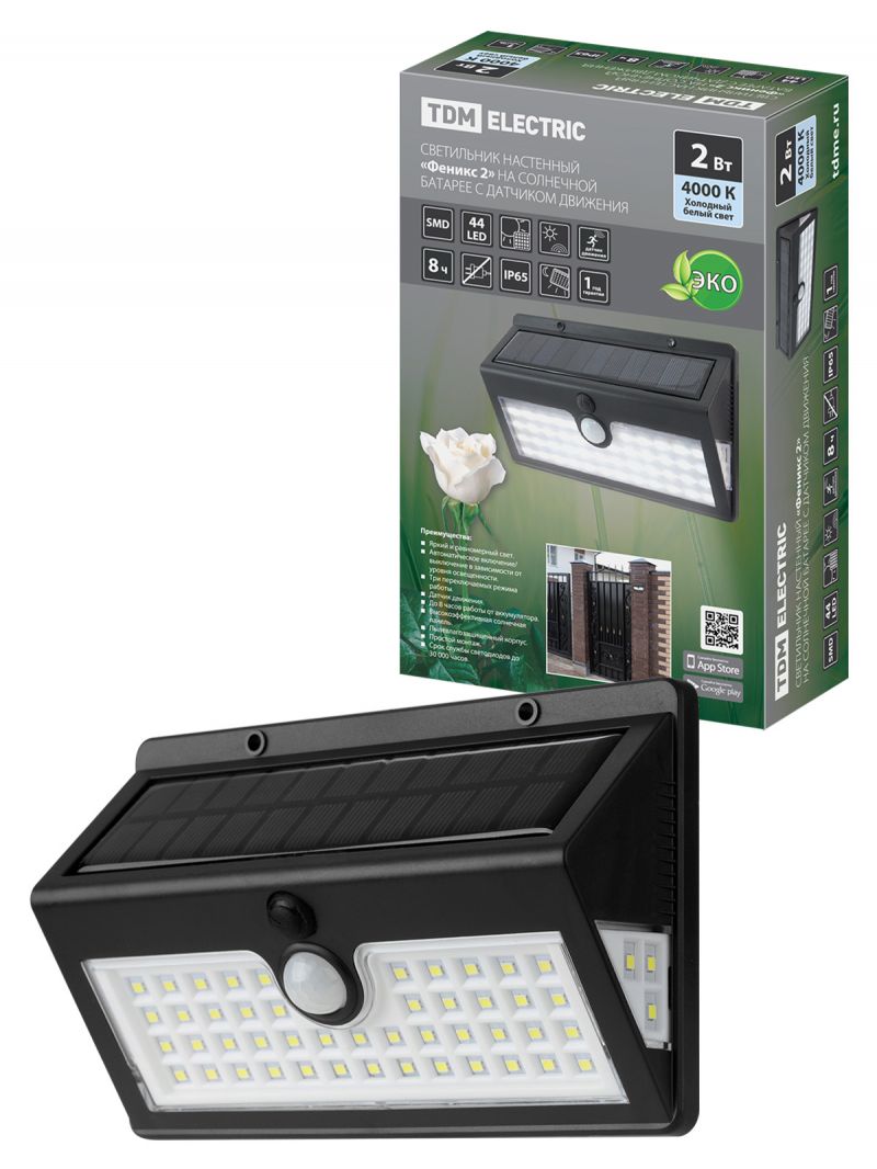 Светильник настенный "Феникс 2" на солн. батарее с датч. движ., 2 Вт, IP65, пластик, черн., TDM