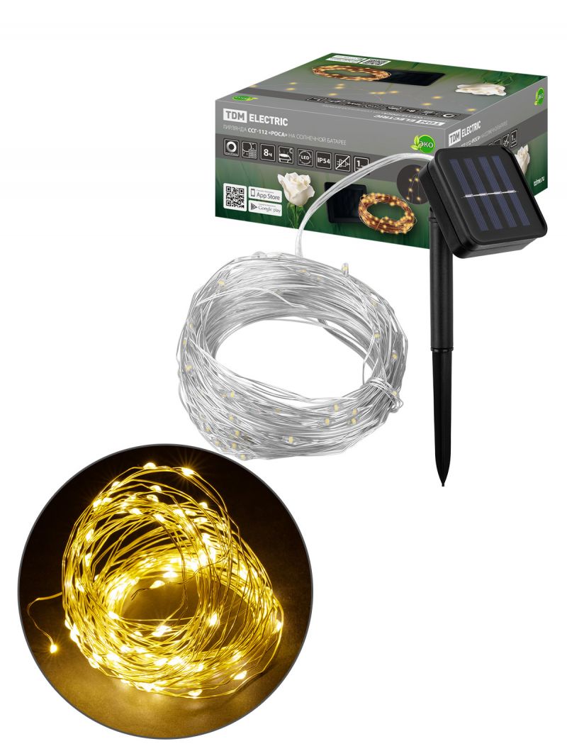 Гирлянда CCГ-112 "Роса" на солнечной батарее, 10 м, 100 LED, теплый белый, IP54, TDM