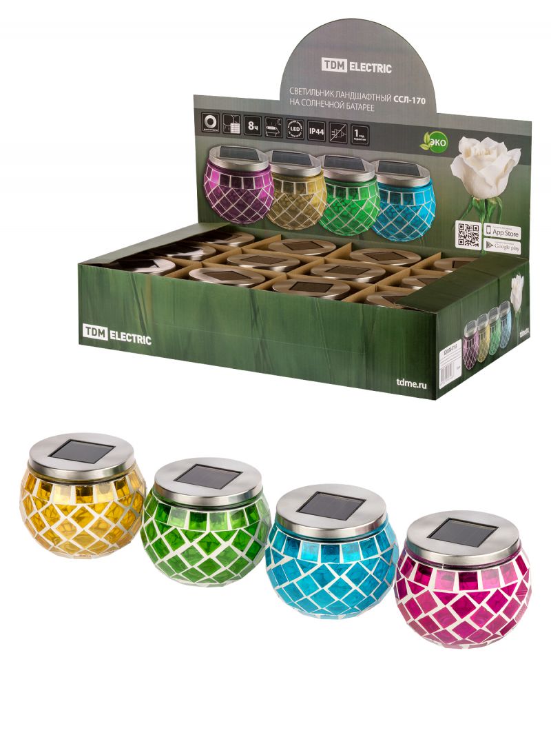 Светильник ландшафтный ССЛ-170 на солн.батарее, 9*9*10,стекло,зеленый,синий,желтый,фиолетовый,ДБ,TDM