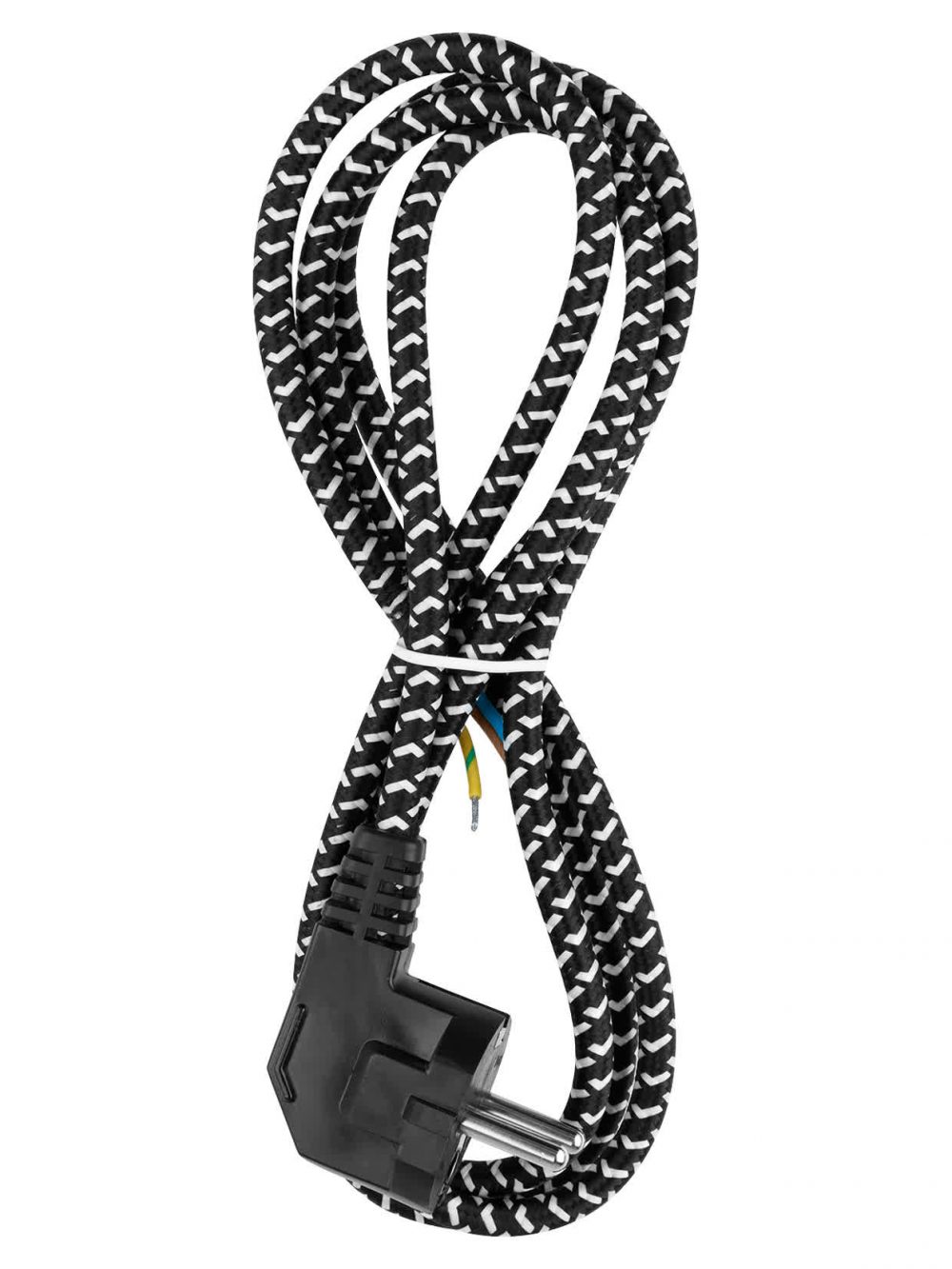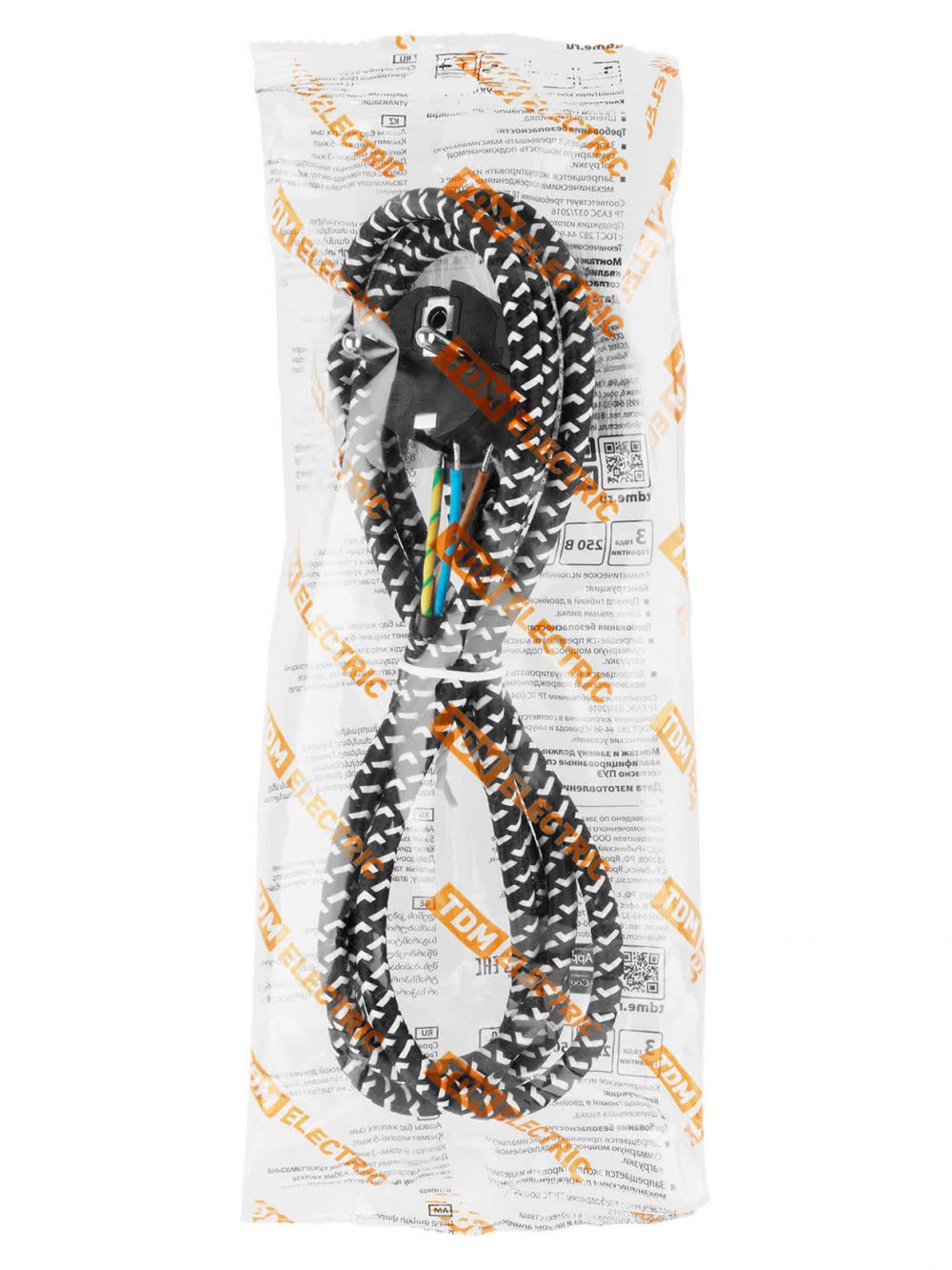 Шнур сетевой с вилкой в тканевой оплетке ПВС-ВП 3x0,75мм2 1,8м, 2400 Вт с/з черный TDM