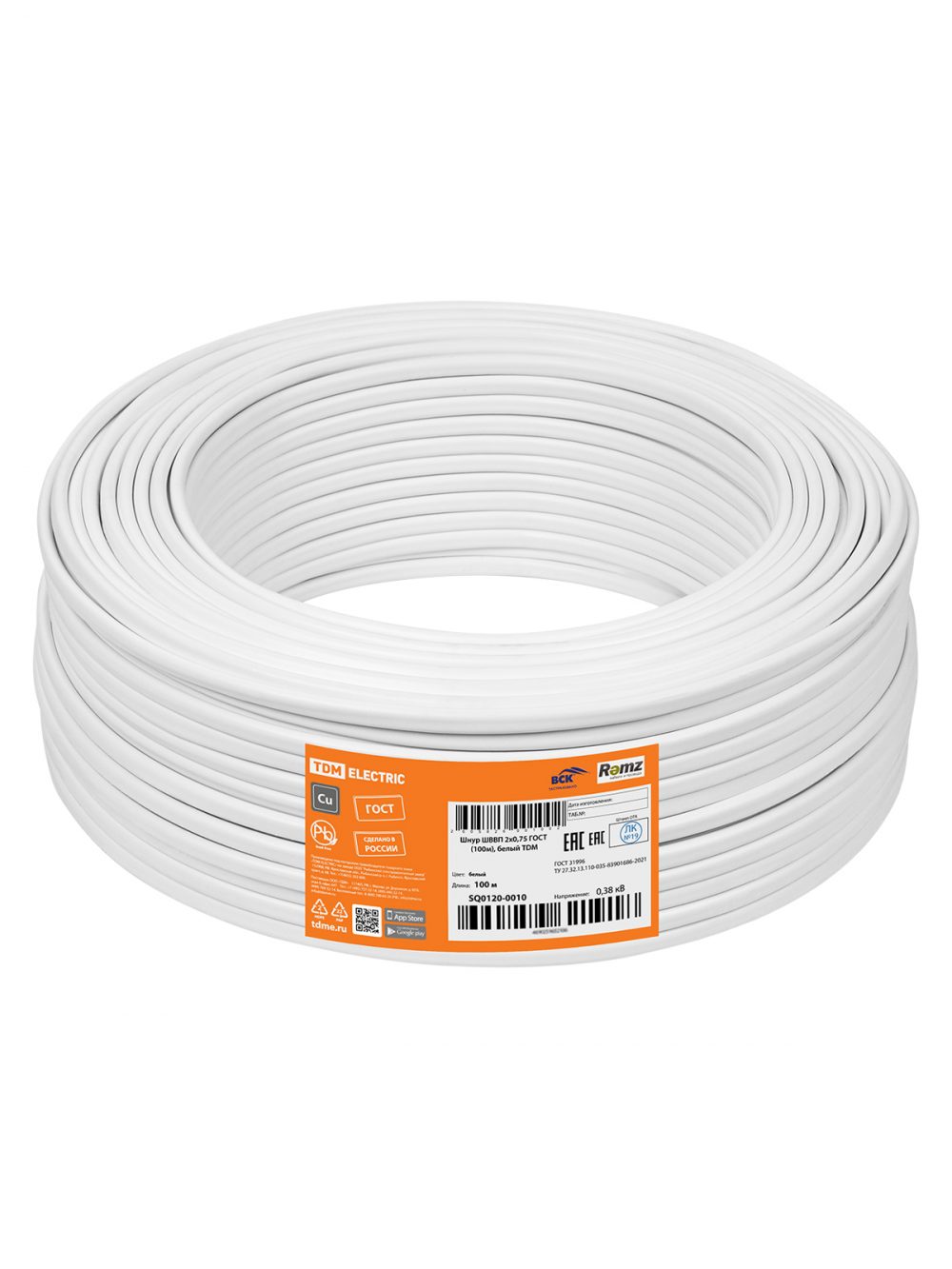 Шнур ШВВП 2х0,75 ГОСТ (100м), белый TDM
