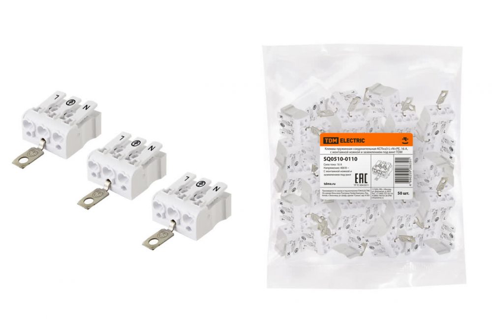 Клемма пружинная соединительная КСПнз3-L+N+PE, 16 A, с монтажной ножкой и заземлением под винт TDM