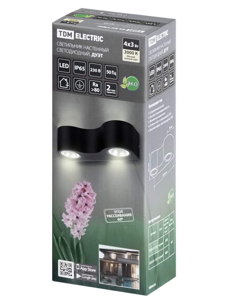Светильник настенный LED, Дуэт, 4х3 Вт, 3000 К, L200 мм, алюм./черн., вверх/вниз, IP65, TDM