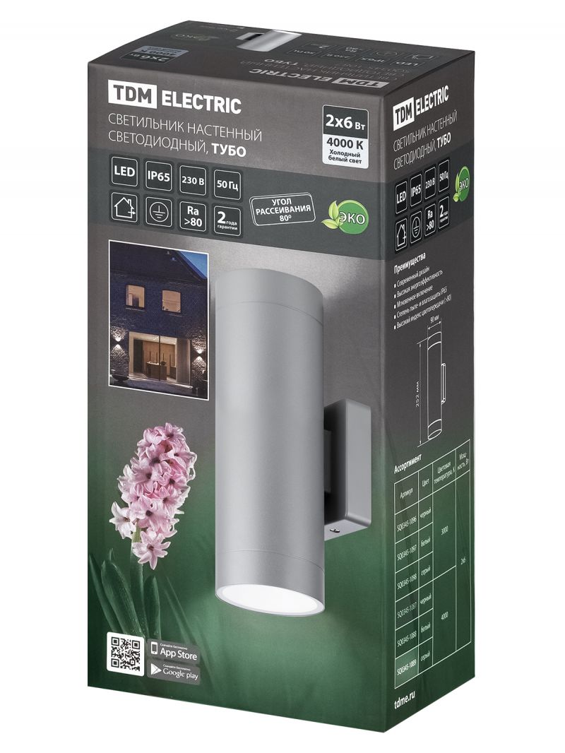 Светильник настенный LED, Тубо, 2х6 Вт, 4000 К, H252 мм, алюм./сер., вверх/вниз, IP65, TDM