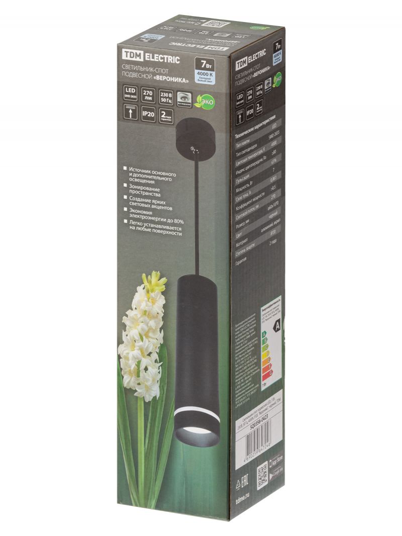Светильник-спот подвесной LED, 7 Вт, 230 В, 50 Гц, 4000К, IP20, "Вероника", черный, TDM