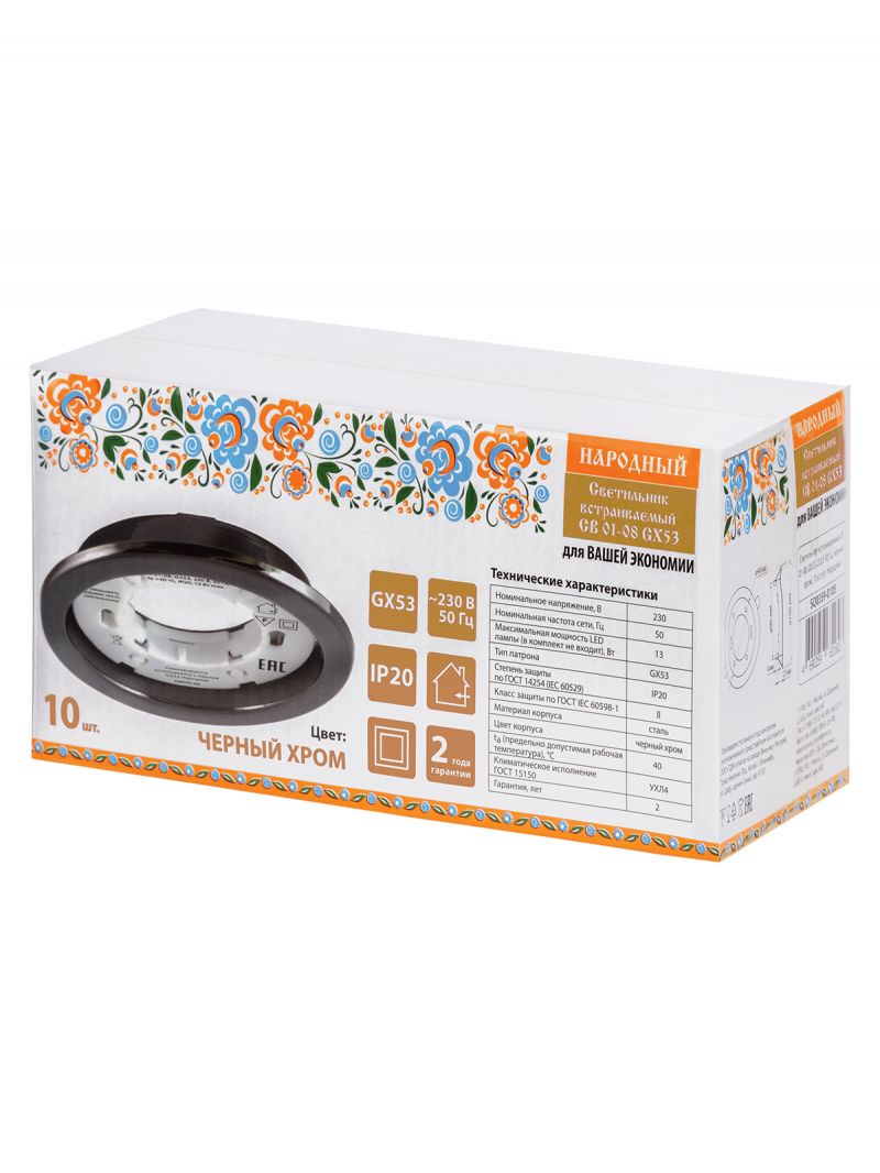 Светильник встраиваемый СВ 01-08 GX53 220 В 50 Гц, черный хром, 10 шт/уп, Народный