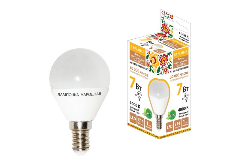 Лампа светодиодная FG45-7 Вт-230 В-4000 К–E14 Народная