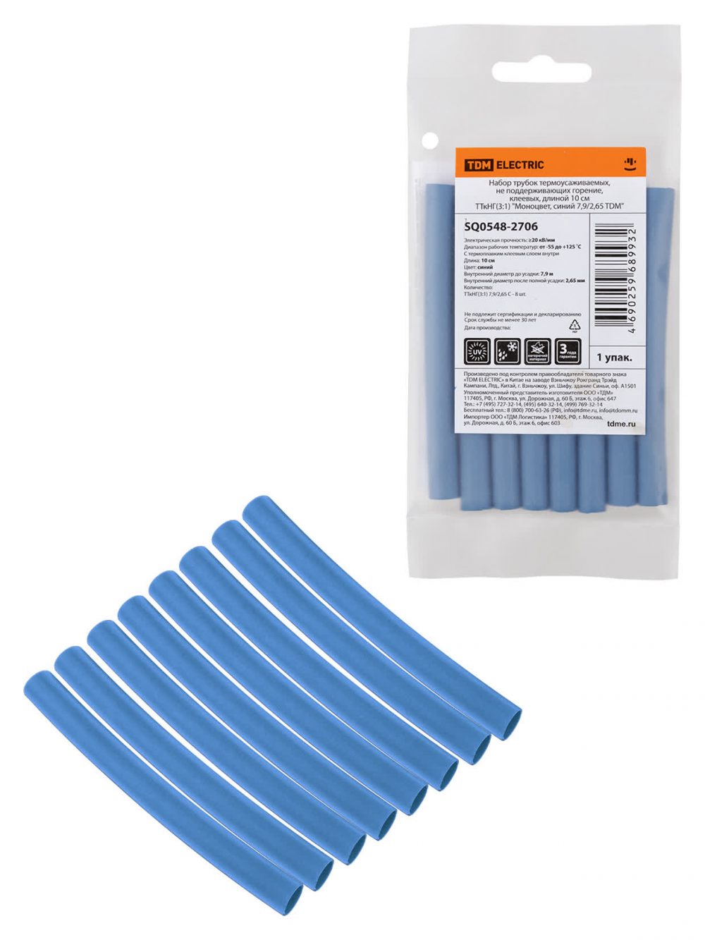 Набор трубок термоусаживаемых, не поддерживающих горение, клеевых, длиной 10 см ТТкНГ(3:1) "Моноцвет, си ний 7,9/2,65 TDM"