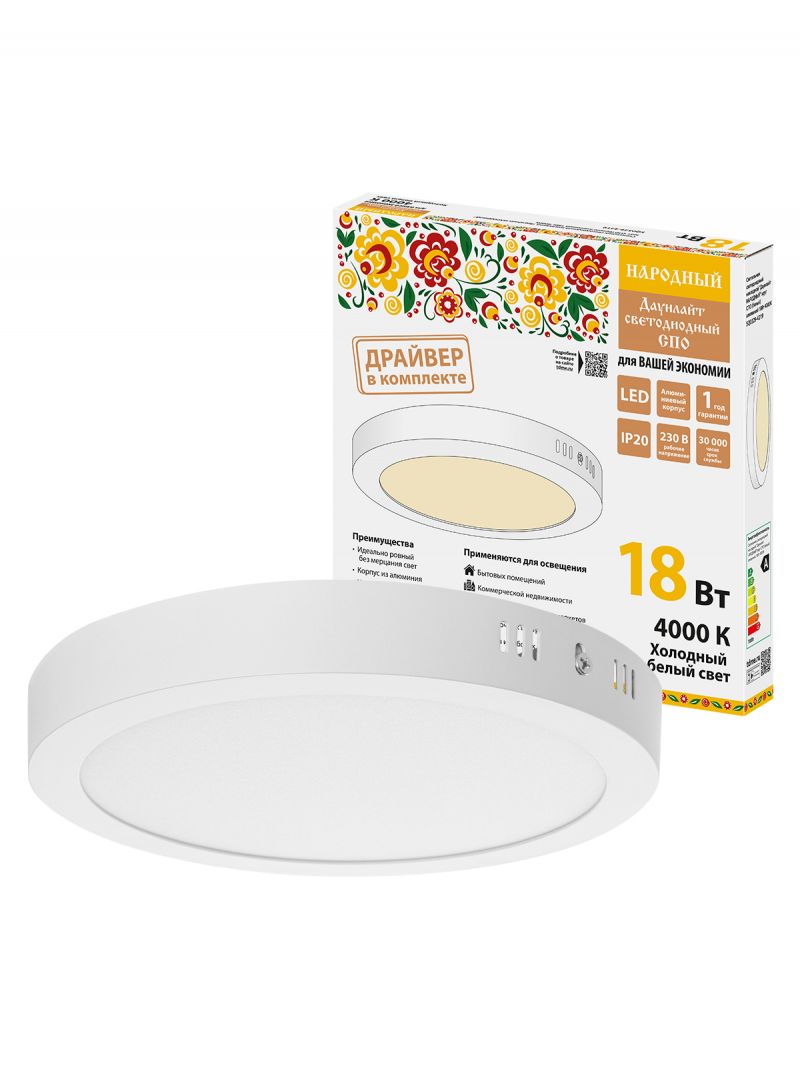 Светильник светодиодный накладной "Даунлайт НАРОДНЫЙ" круг СПО (белый) алюминий 18Вт 4000К