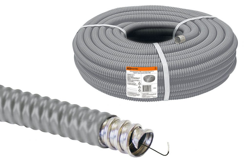 Металлорукав в ПВХ-изоляции РЗ-Ц-П 15 серый с протяжкой (25м) TDM