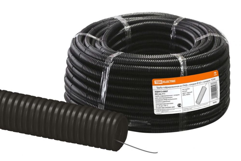 Труба гофрированная ПНД d 63 с зондом (15 м) легкая 350H черная TDM