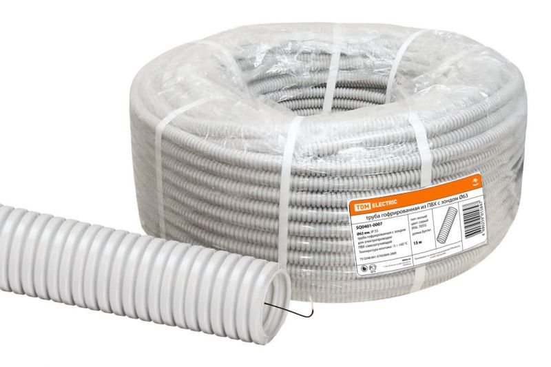 Труба гофрированная ПВХ d 63 с зондом (15 м) легкая 350Н серая TDM